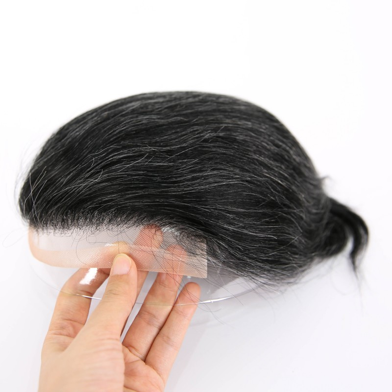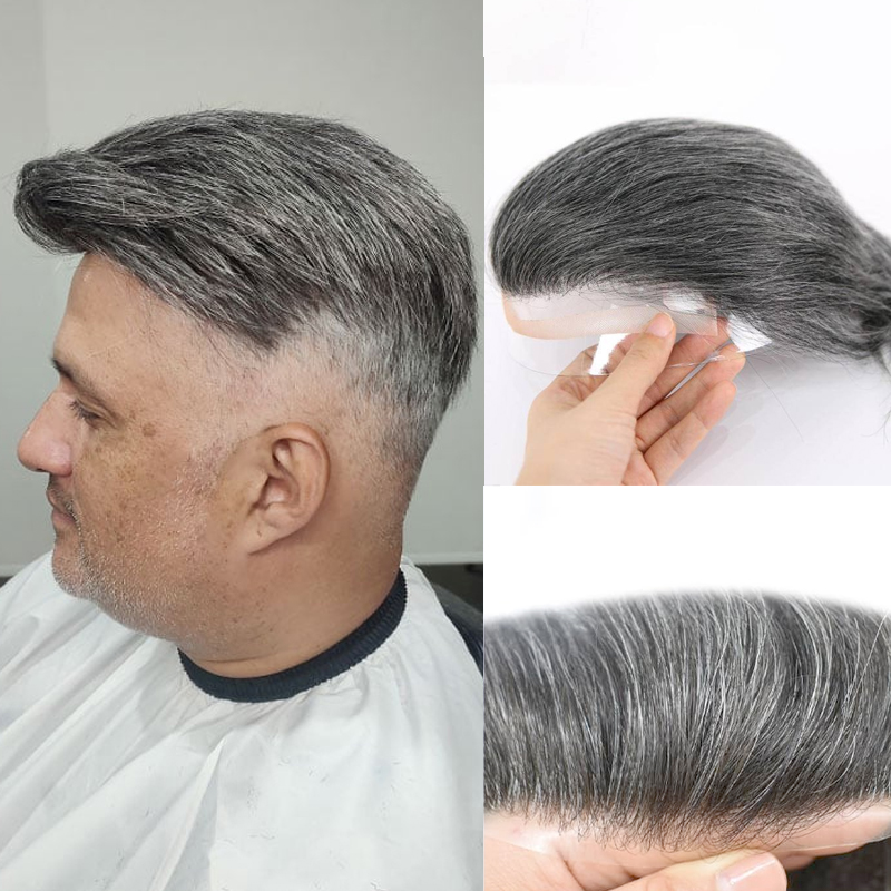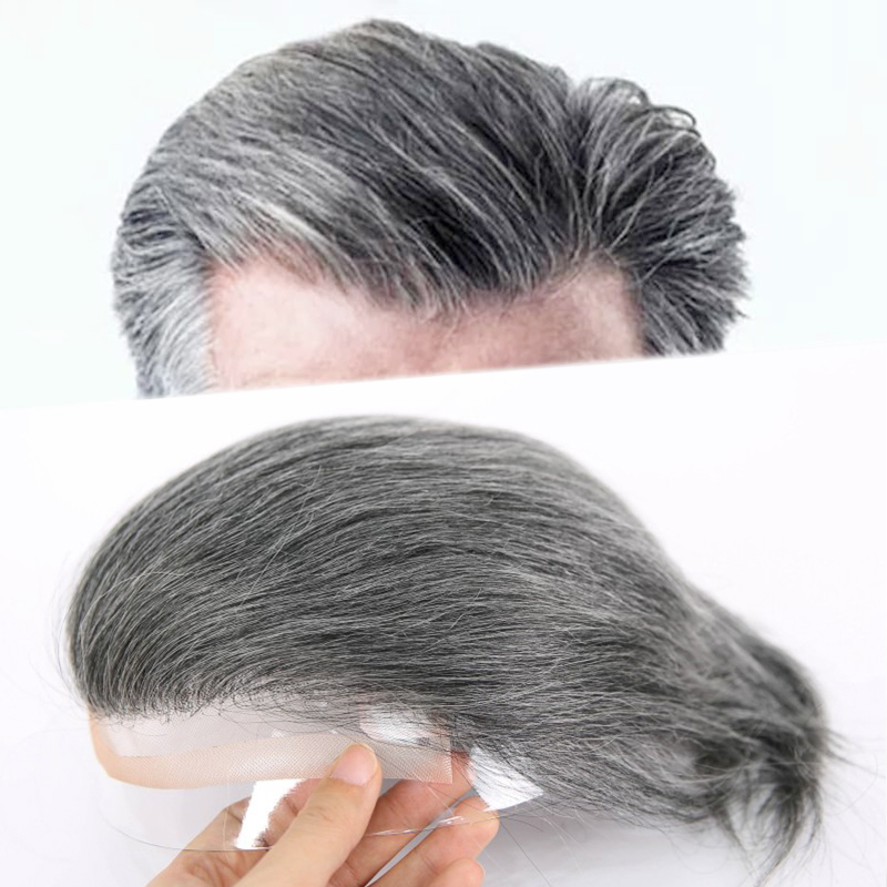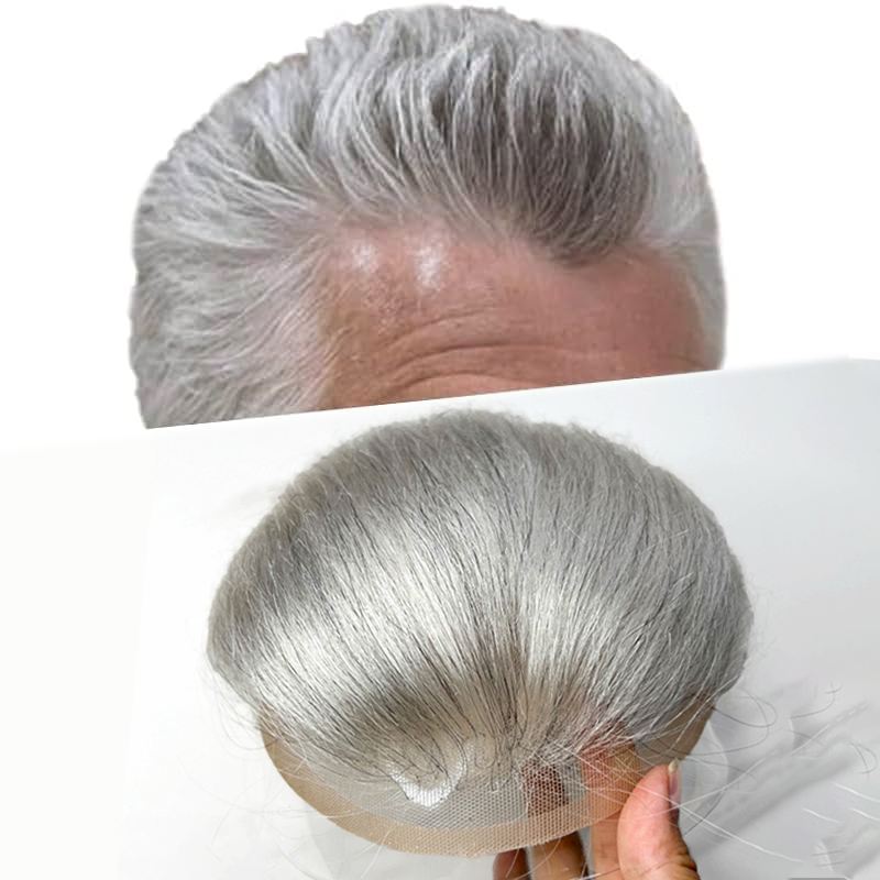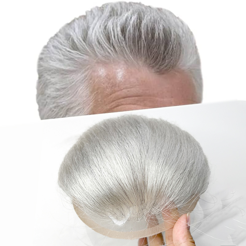 #1B60 Silver Grey Human Hair Toupee Wig Mens Replacement System Mono with PU around Base Wig Toupee